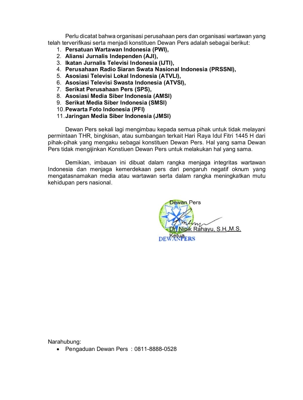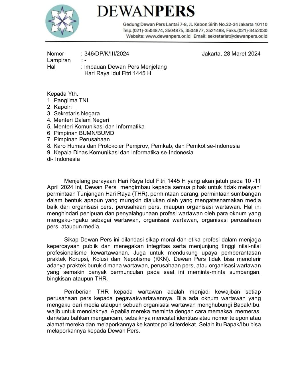 Tertuang dalam surat edaran Dewan Pers nomor 346/DP/K/III/2024, mengenai imbauan Dewan Pers menjelang hari Raya Idul Fitri 1445 H.