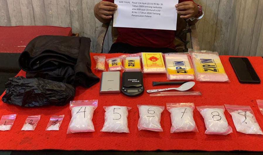 Selain sabu, petugas juga mengamankan sejumlah barang bukti pendukung lainnya berupa dua timbangan digital, plastik klip bening berbagai ukuran, sedotan dan sendok sabu, satu unit handphone Android, serta perlengkapan lain yang digunakan untuk aktivitas peredaran narkotika.