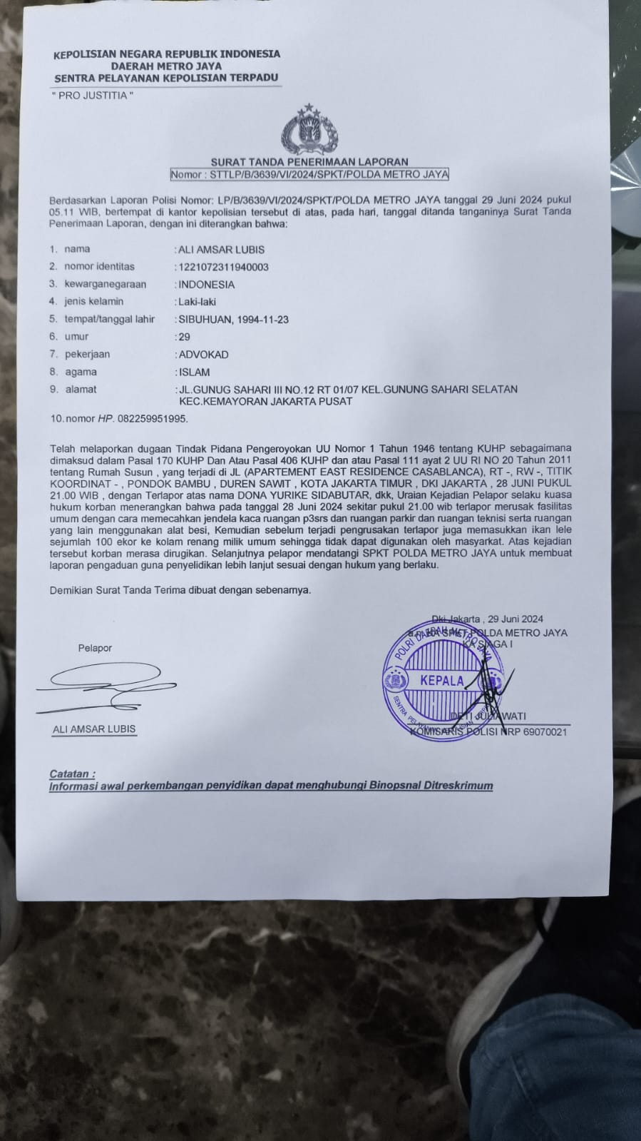 Khairul Imam Ketua penghuni Perkumpulan pengelola Rumah Susun atas kejadian ini esok pagi nya melapor ke Polsek Duren sawit untuk Polisi dapat memberikan perlindungan dan pengamanan di lokasi apatemen Casablanca Pondok Bambu. (Edi Sastro)