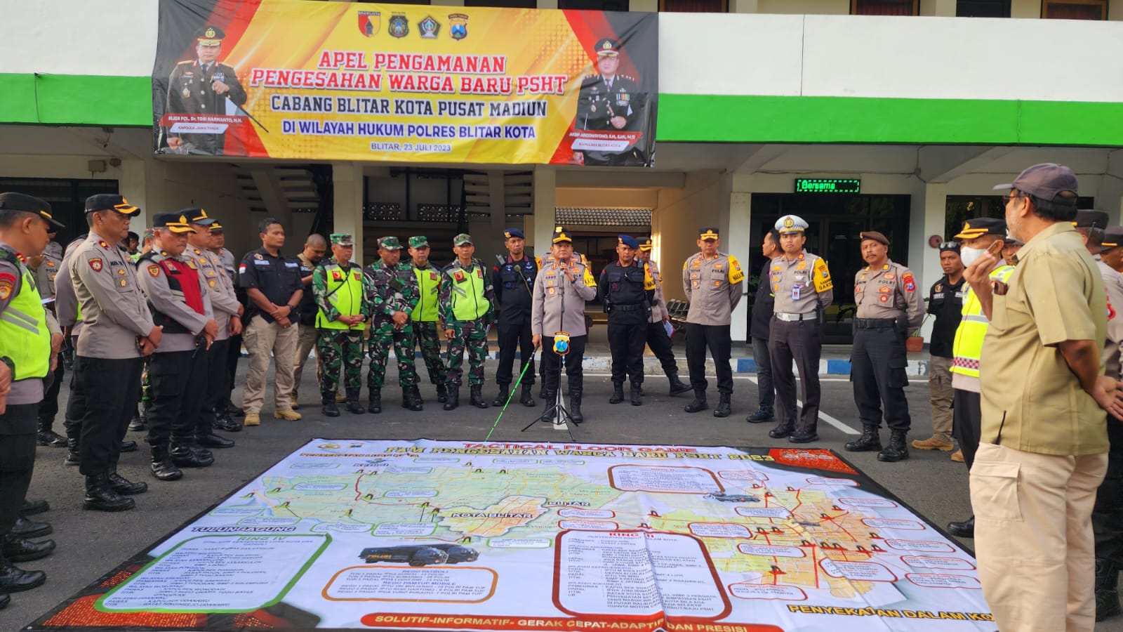 Apel kesiapan pengamanan pengesahan warga baru PSHT tersebut digelar di Gedung Serbaguna Pemkab Blitar Jl Sudanco Supriyadi Kota Blitar dipimpin oleh Kapolres Blitar Kota AKBP Argowiyono yang melibatkan 645 personel Polres Blitar Kota dibantu 1 Kompi BKO Brimob Malang, TNI dari Kodim 0808, Dinas perhubungan, Satpol PP Kota Blitar serta melibatkan Pengamanan Terate (Pamter), Minggu (23/07/23) sore.