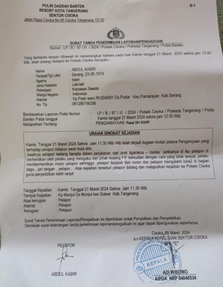 “Ini kan aneh persoalan antara debitur dan kreditur yang sudah ditangani secara hukum oleh kuasa hukum FIF Rangkasbitung malah dikuasakan kembali kepada jasa DC yang bertingkah seperti preman tanpa menunjukan legalitas, memaksakan kehendak untuk kepentingan pribadi dan golongannya, mengintimidasi seseorang bahkan melakukan tindakan diluar batas dengan menjatuhkan dengan sengaja kendaraan yang sedang saya kendarai hingga melukai fisik saya, karena hal ini saya anggap sudah mengarah ke perbuatan pidana maka saya laporkan kejadian yang menimpa saya ini ke aparat penegak hukum di wilayah tersebut atau Polsek Cisoka, ” ungkap Abdul Kabir sambil memperlihatkan luka – luka yang ia alami kepada rekan media.
